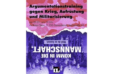 Am Donnerstag, d. 29.01.2026, 19:00 Uhr führen wir im Roten Stern (Gewerbehof Karlsruhe, Steinstraße 23) ein Argumentationstraining gegen Krieg, Aufrüstung und Militarisierung durch.