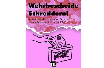 Im Rahmen unseres monatlichen Café Commune wollen wir gemeinsam Wehrbescheide schreddern.Am Freitag, d. 06.02. um 19:00 Uhr im Roten Stern, Gewerbehof Karlsruhe, Steinstraße 23.Aufruf zum Wehrpflicht Schreddern